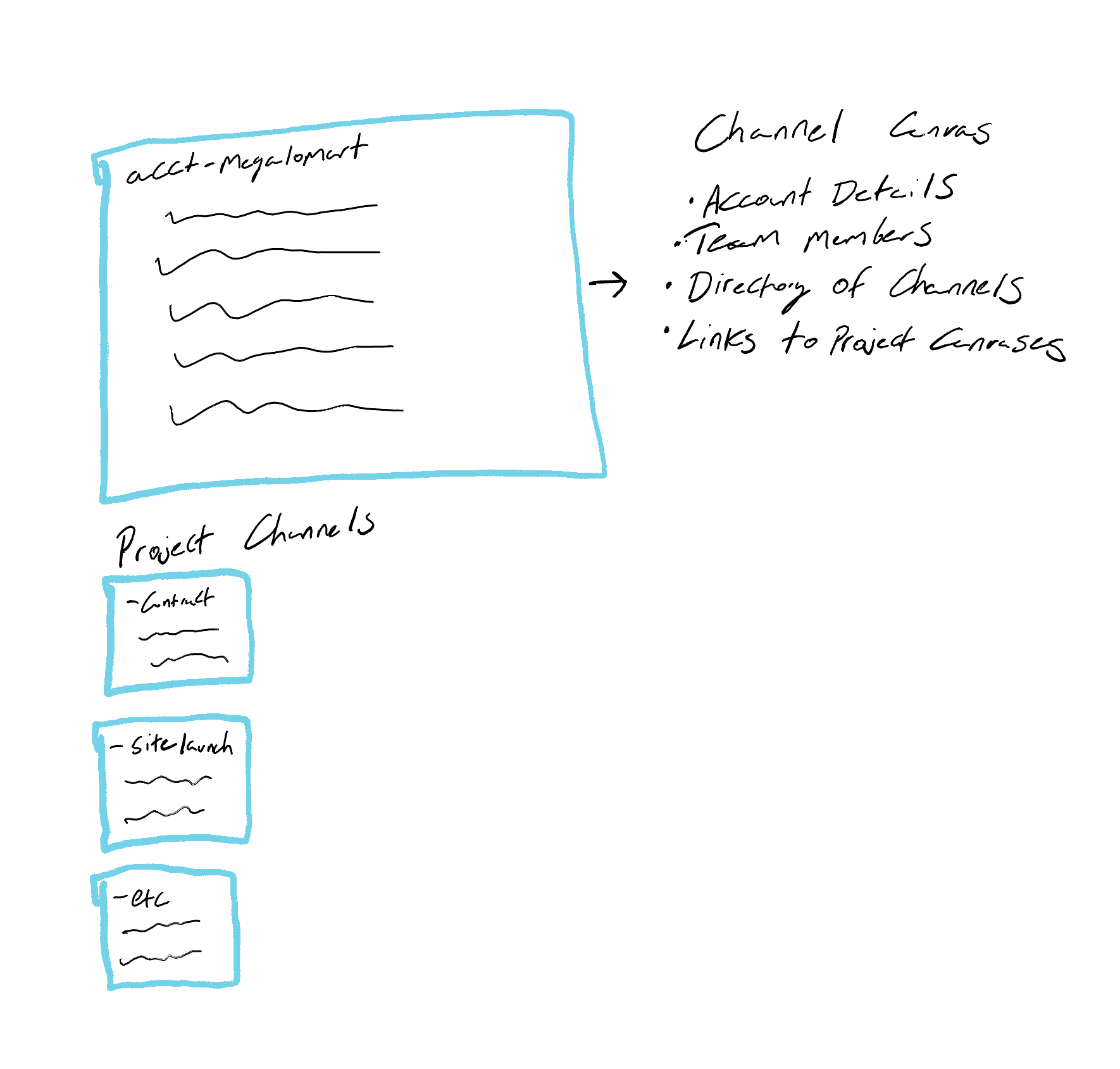 This makes a Canvas a great way to give users context about the type of work that takes place in that given channel. In the case of the agency I worked with in this post, my recommendation was to set up a channel Canvas for their account, and link other Canvases inside there that contain details about individual projects that are going on within the account. For an example, see the following gif.