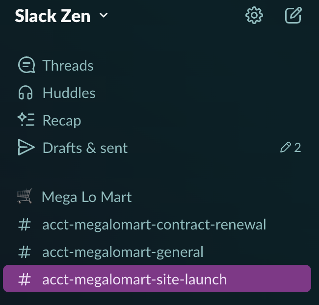 In the pictured example, a section in the sidebar is set up for a single customer – Mega Lo Mart – and within that section, there are channels for general account management, as well as channels for individual workstreams like a contract renewal, and a site launch.